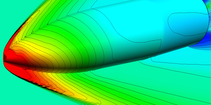 極超音速流中では流体が非常に高い運動エネルギーを持つため、飛翔体周りで2000Kを超えるような高温領域が形成されます。このような温度域では大気自体が分子から原子となる解離反応を引き起こすため圧縮性反応流として取り扱う必要があります。上の図では飛翔体周りで生じる酸素原子のモル分率を示しています。